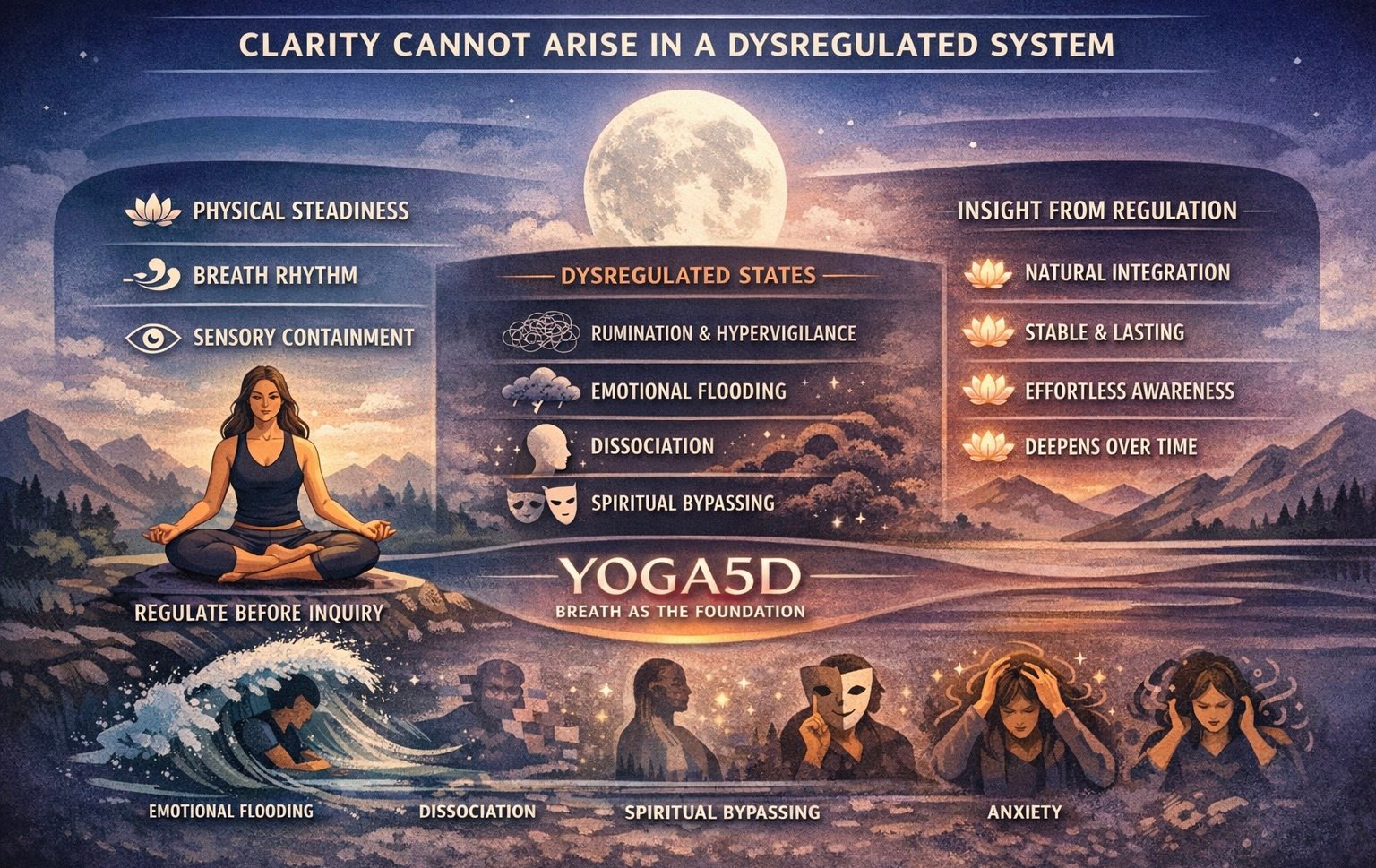 At YOGA5D, breath is used to establish baseline regulation before any deeper inquiry. Without this foundation, attempts at insight often lead to: